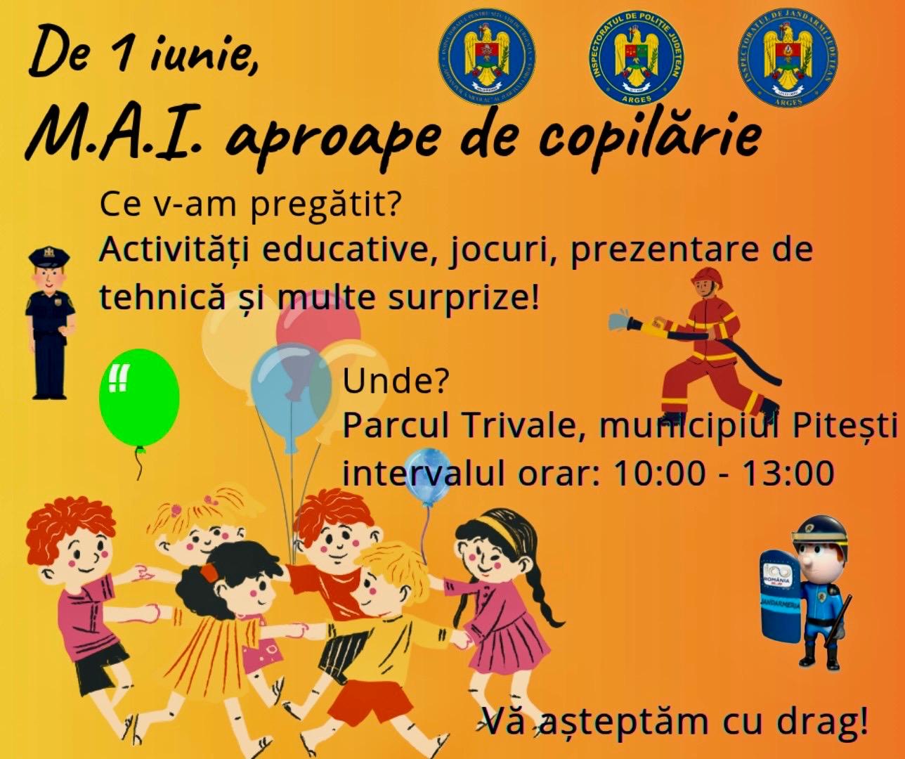 Astfel, în data de 1 iunie, intervalul orar 10:00-13:00, în Parcul Trivale din municipiul Pitești, zona Grota Rece, puteți descoperi cum arată o zi din viața unui salvator! Aici sunt planificate a se desfășura o serie de activități dedicate copiilor, menite să le ofere acestora o experiență educativă și de neuitat. Prezentarea tehnicii din dotare, punctele de informare preventivă, modul în care personalul civil poate face parte din arma pompieri, dar și modul de acordare a prim ajutorului, în diferite situații de urgență, sunt doar câteva dintre acțiunile pe care le vom întreprinde.