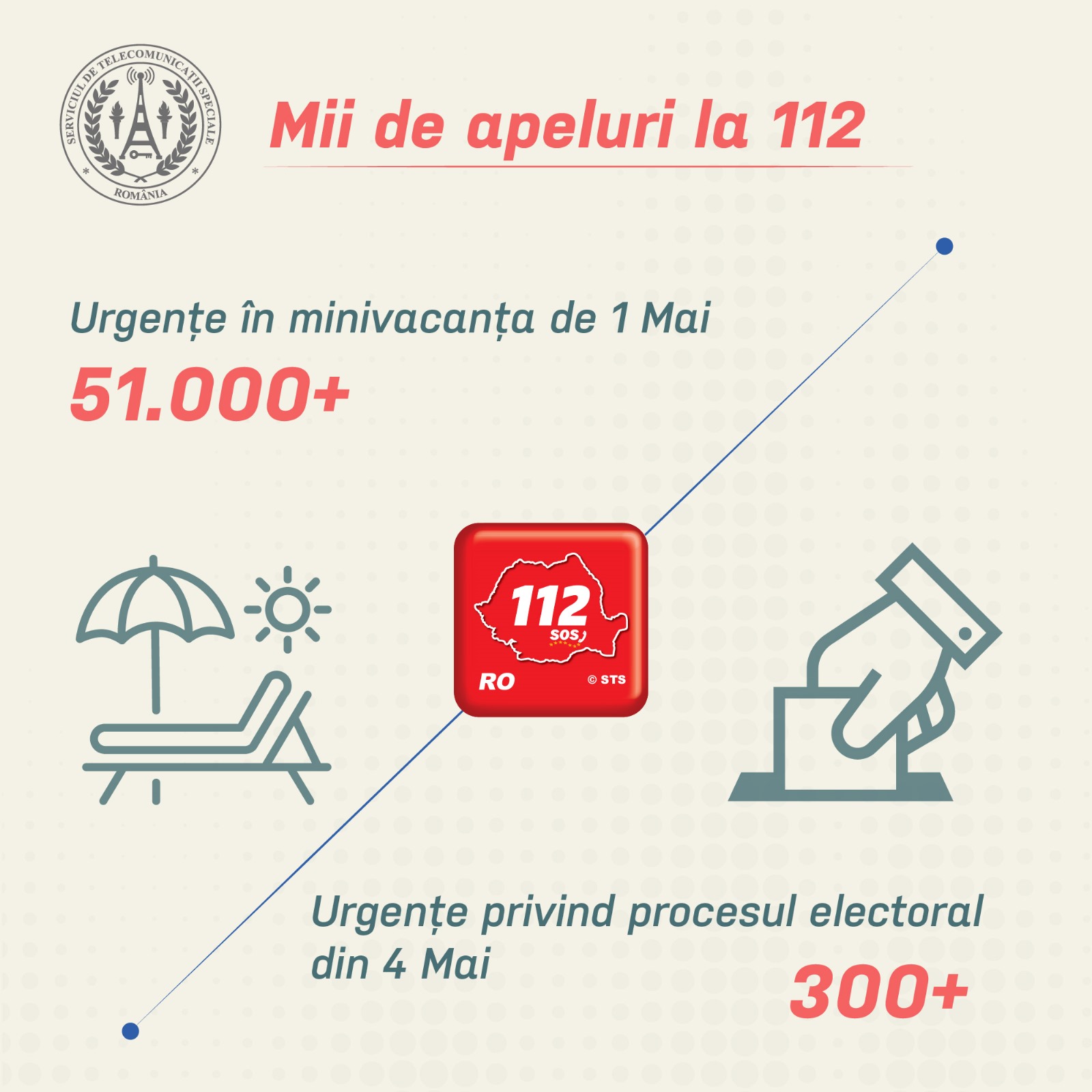 În perioada 1 – 4 mai a.c., la nivel național, operatorii STS au preluat și procesat 86.603 apeluri primite la numărul de urgență 112. Din totalul acestora, 59,27% (51.333) au reprezentat cazuri de urgență și au fost transferate către agențiile specializate de intervenție: Ambulanță, ISU-SMURD, Poliție, Jandarmerie sau Salvamont.
